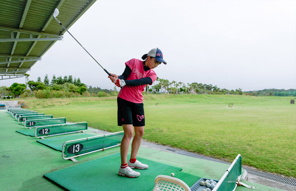 瀬嵩カントリークラブのドライビングレンジでショット練習やスイングのチェックを行います。